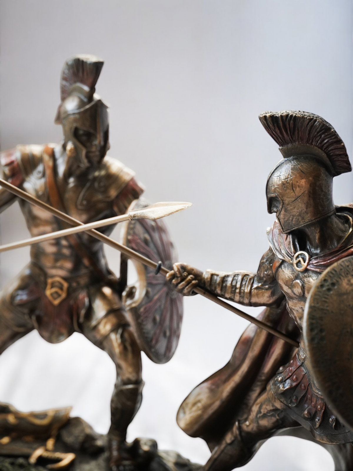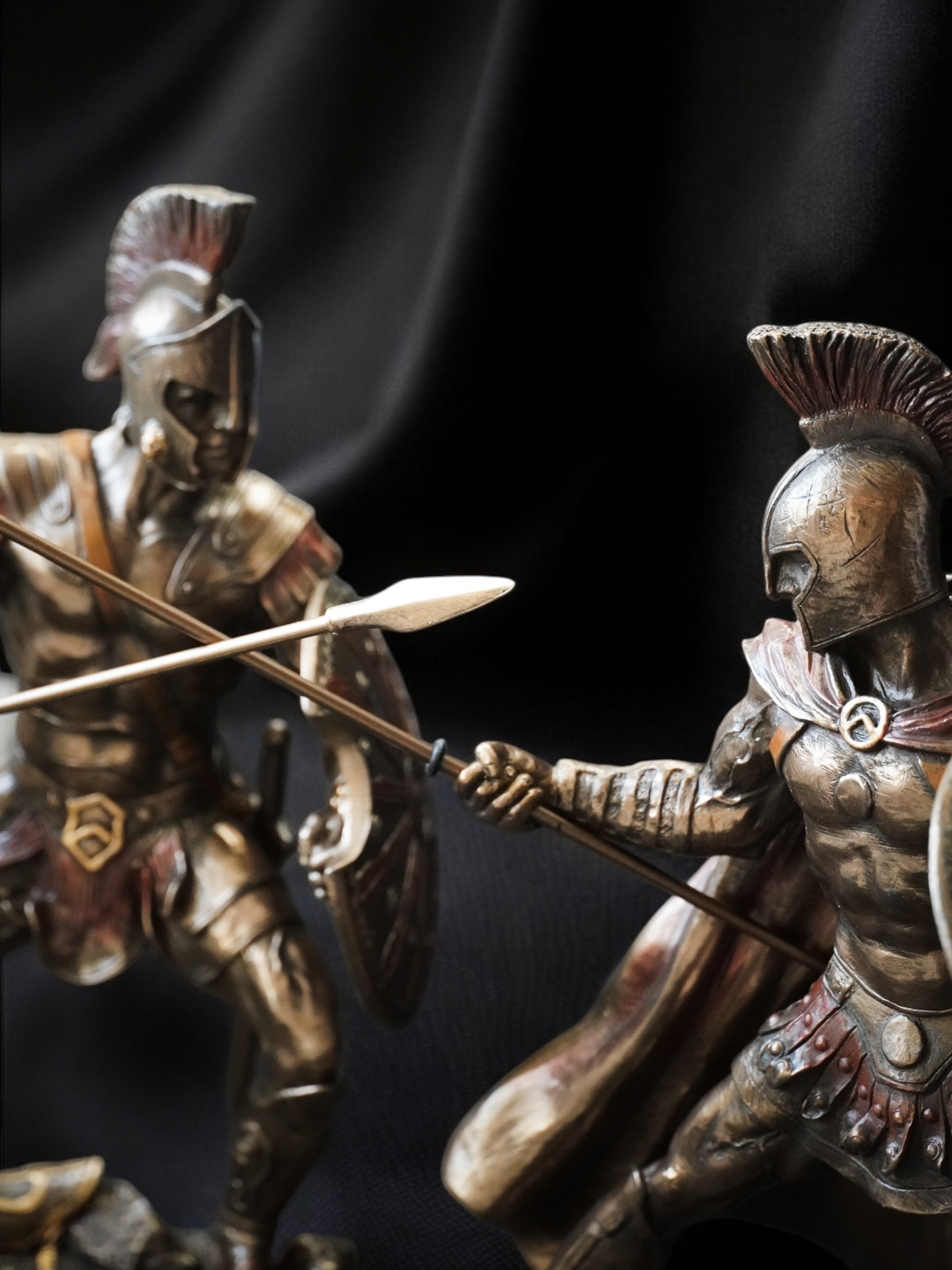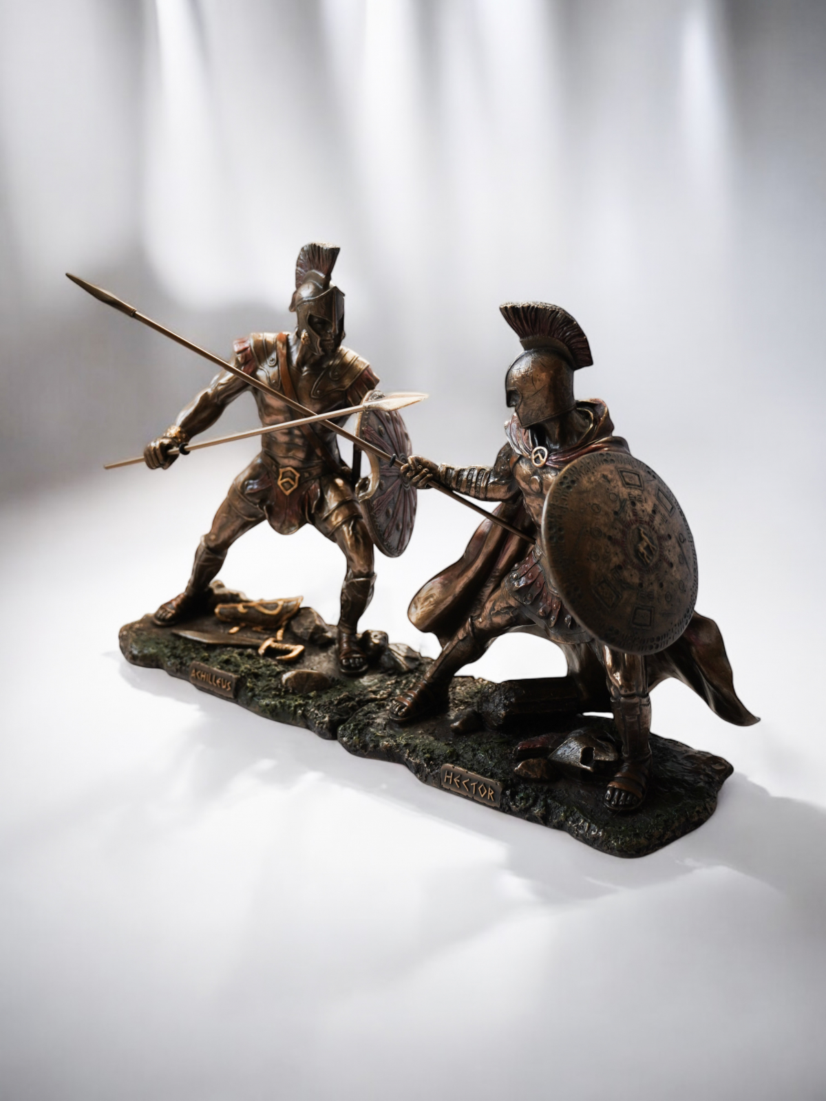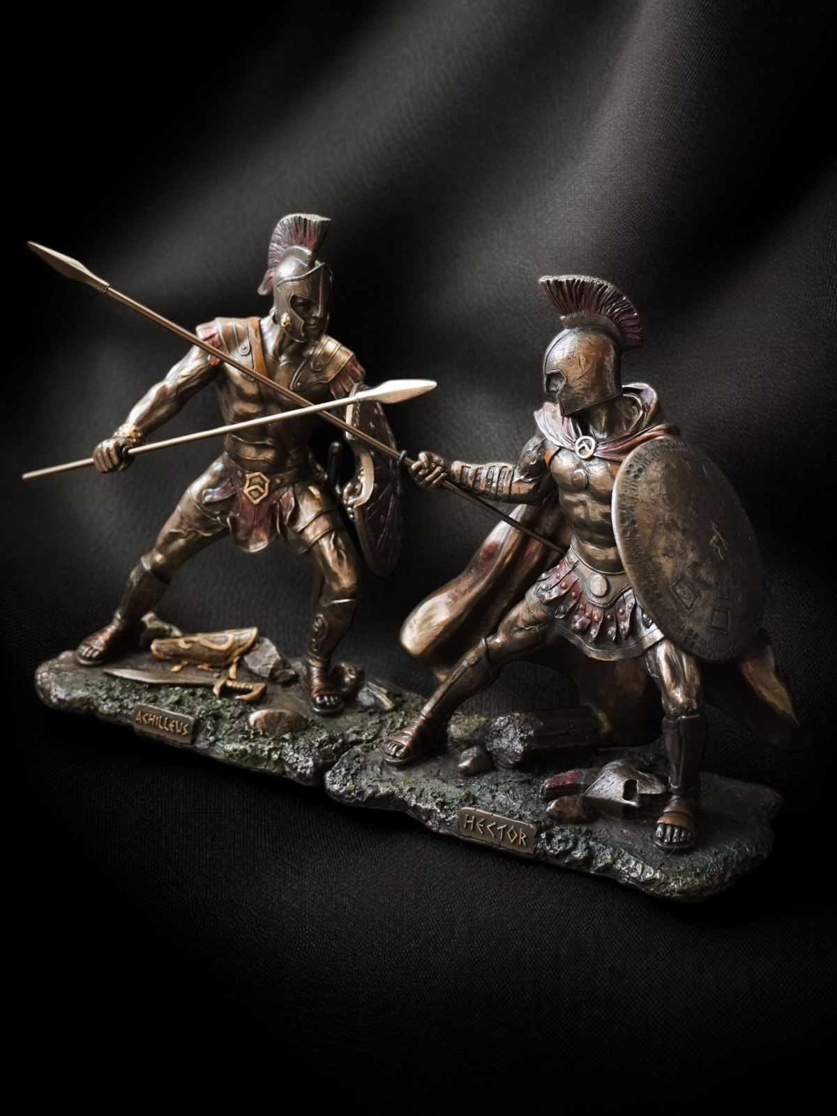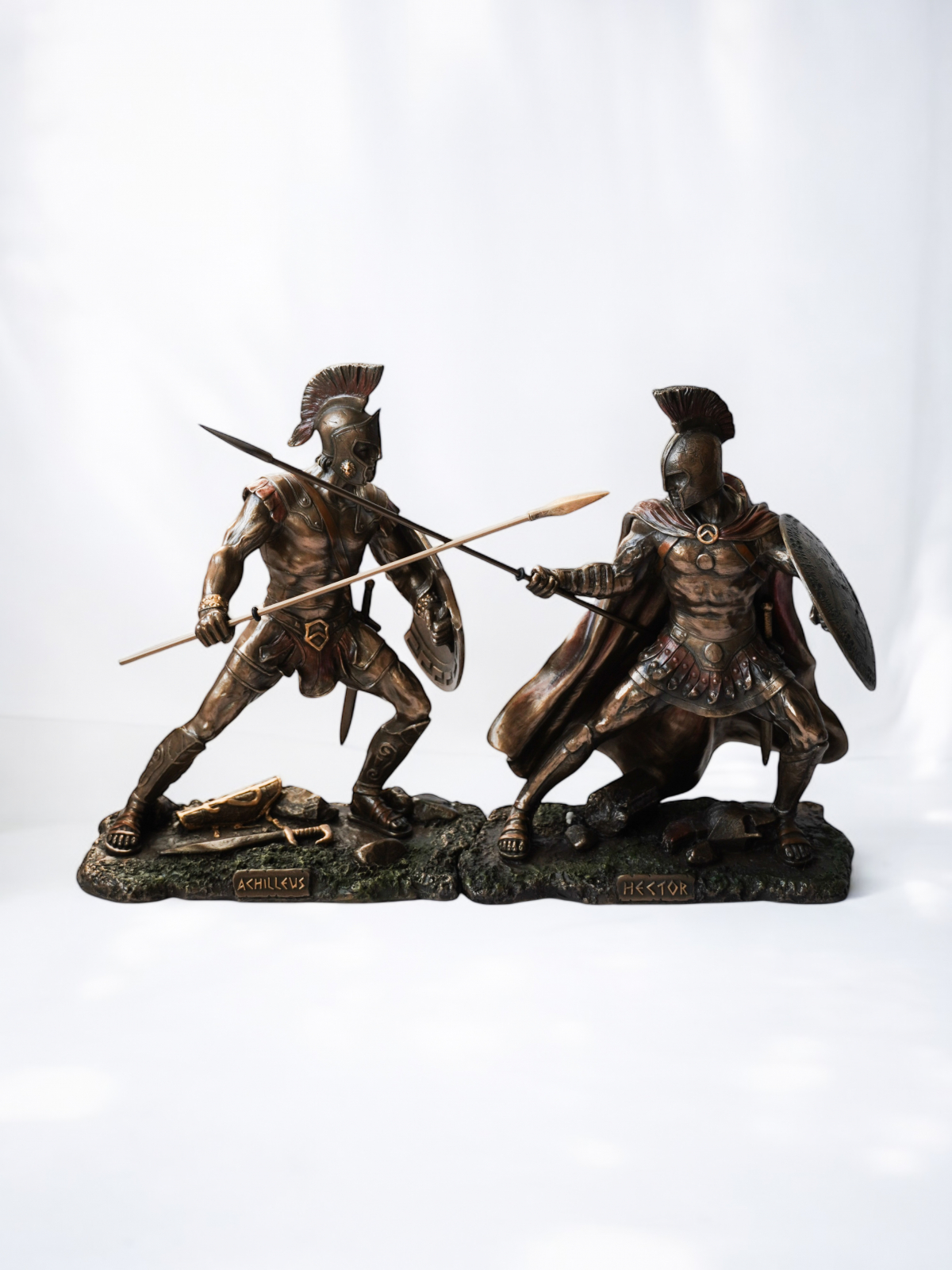Statuetele surprind perfect momentul luptei: Ahile, în poziție de atac, își încordează mușchii, gata să lovească, exprimând forță, furie și dorința de răzbunare. Hector, deși conștient de soarta sa, își păstrează demnitatea, adoptând o poziție defensivă, cu scutul ridicat și sulița pregătită. Acest set nu doar redă un moment crucial al mitologiei grecești, ci și simbolizează contrastul dintre destin și voință, datorie și furie, curaj și răzbunare.