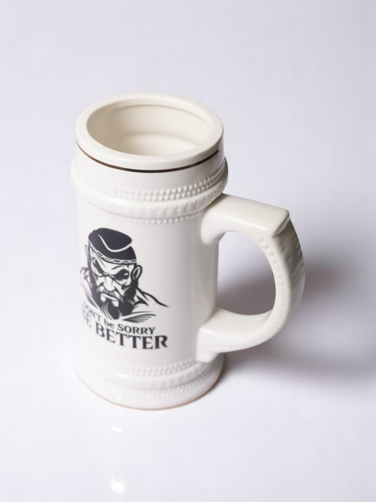 Inspirată din forța și înțelepciunea străbunilor, această halbă de bere din ceramică este decorată cu un portret stilizat de geto-dac – o figură impunătoare, cu privirea hotărâtă și o expresie care emană putere – însoțită de mesajul: „DON’T BE SORRY, BE BETTER”. Simbol al voinței neînfrânate, mesajul reamintește că nu ești definit de greșeli, ci de puterea de a le depăși și de a deveni mai bun.