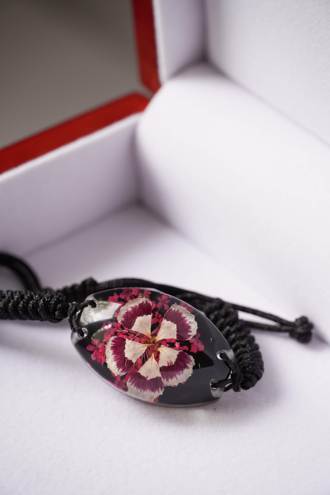 Un fragment de natură prins în timp, gata să te însoțească zi de zi. Această brățară surprinde frumusețea delicată a unei garofițe reale, conservată cu grijă în rășină transparentă, ca într-o picătură de timp. Fiecare floare este unică, culeasă manual și așezată cu migală, astfel încât să-și păstreze farmecul viu, exact cum a fost în ziua în care a înflorit. Florile nu au fost capturate din natură, ci din din ferme controlate, fără a provoca daune mediului înconjurător.