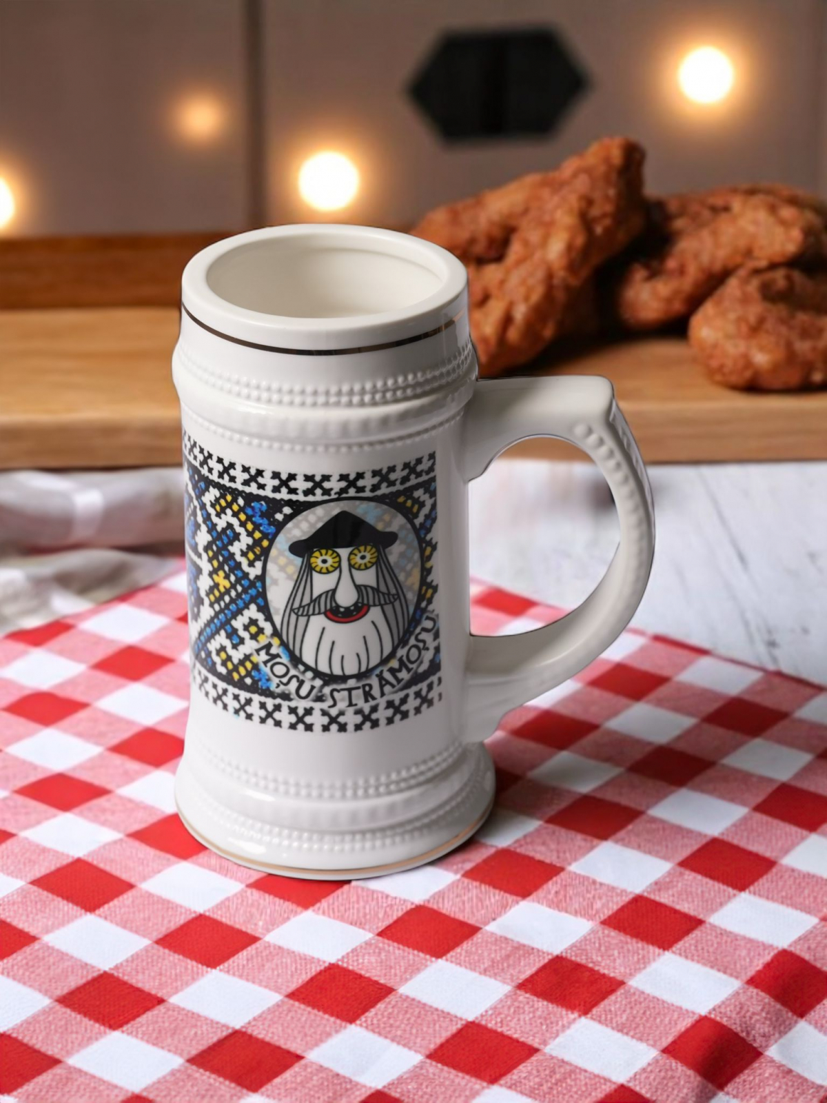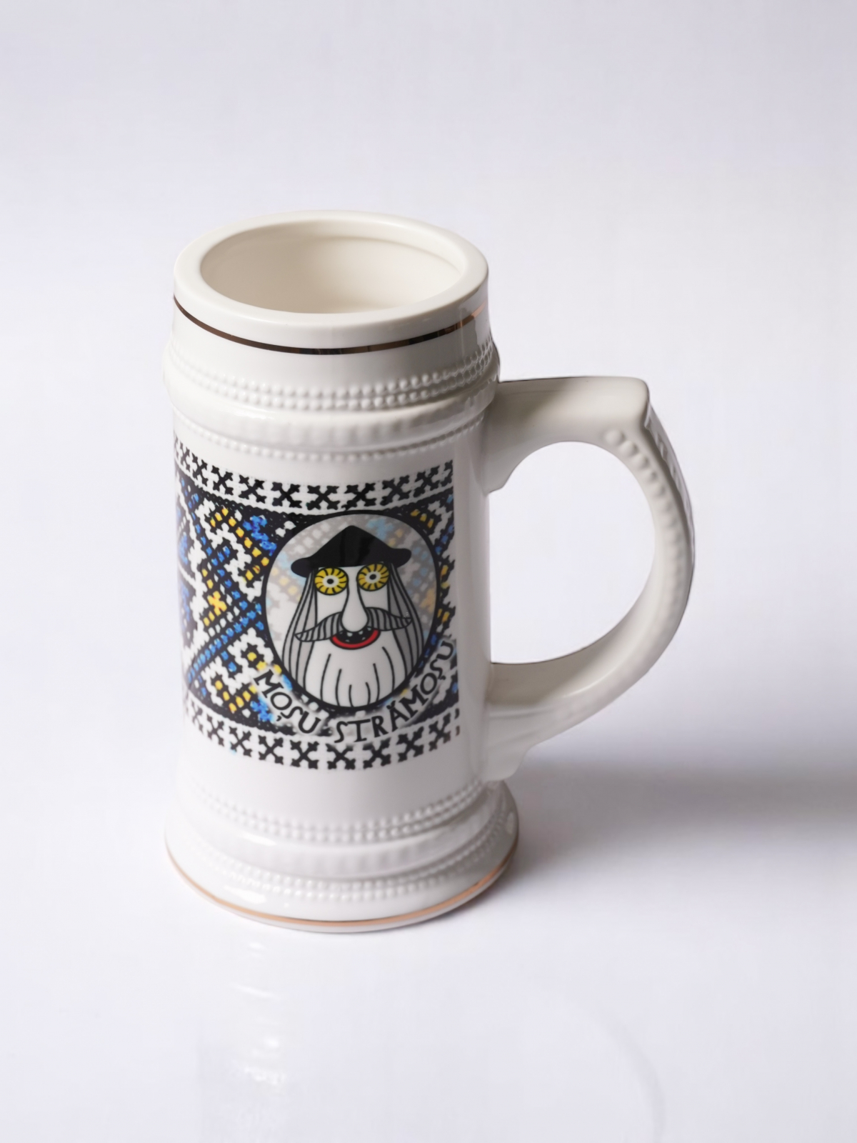 Savurează fiecare înghițitură cu această halbă de bere ceramică, decorată cu un motiv autentic inspirat din tradițiile maramureșene. Modelul de pe halbă reproduce un fragment de țesătură populară, cu motive tradiționale specifice zonei. În centru se regăsește chipul emblematic al lui MOȘU STRĂMOȘU – un simbol al înțelepciunii, rădăcinilor adânci și spiritului românesc.