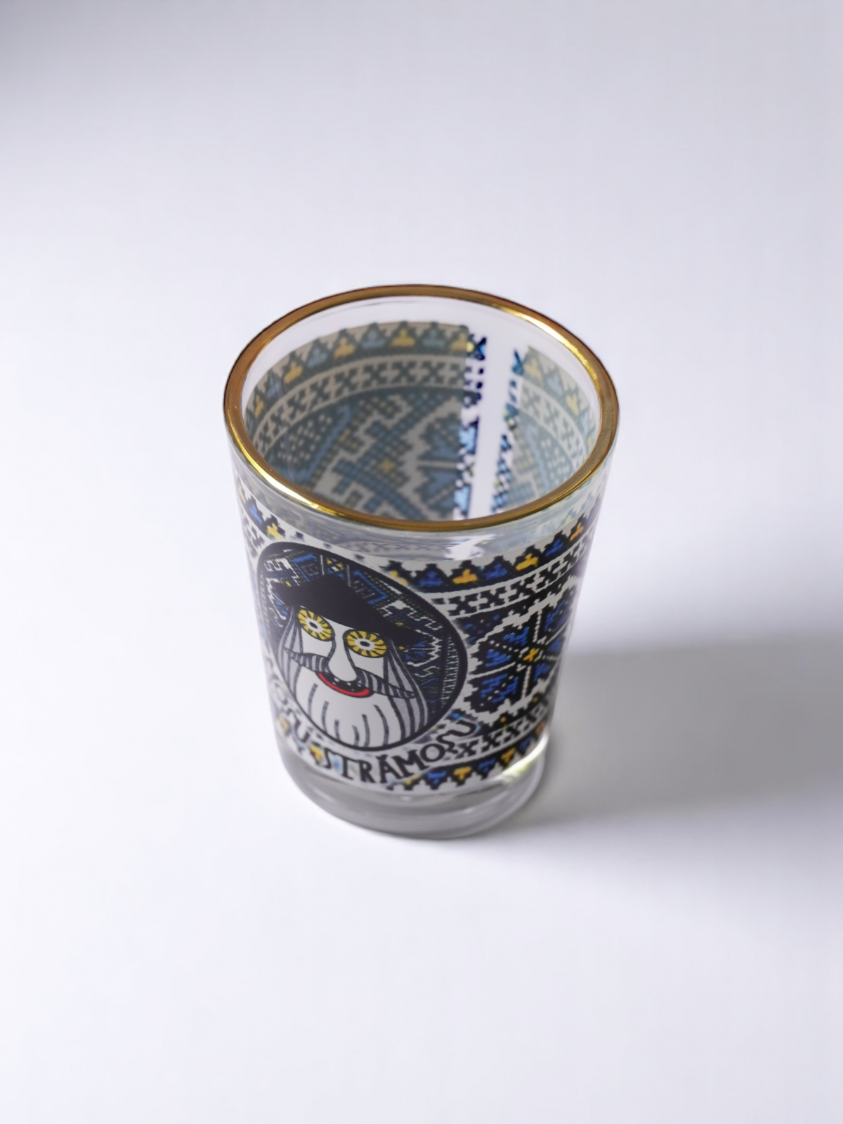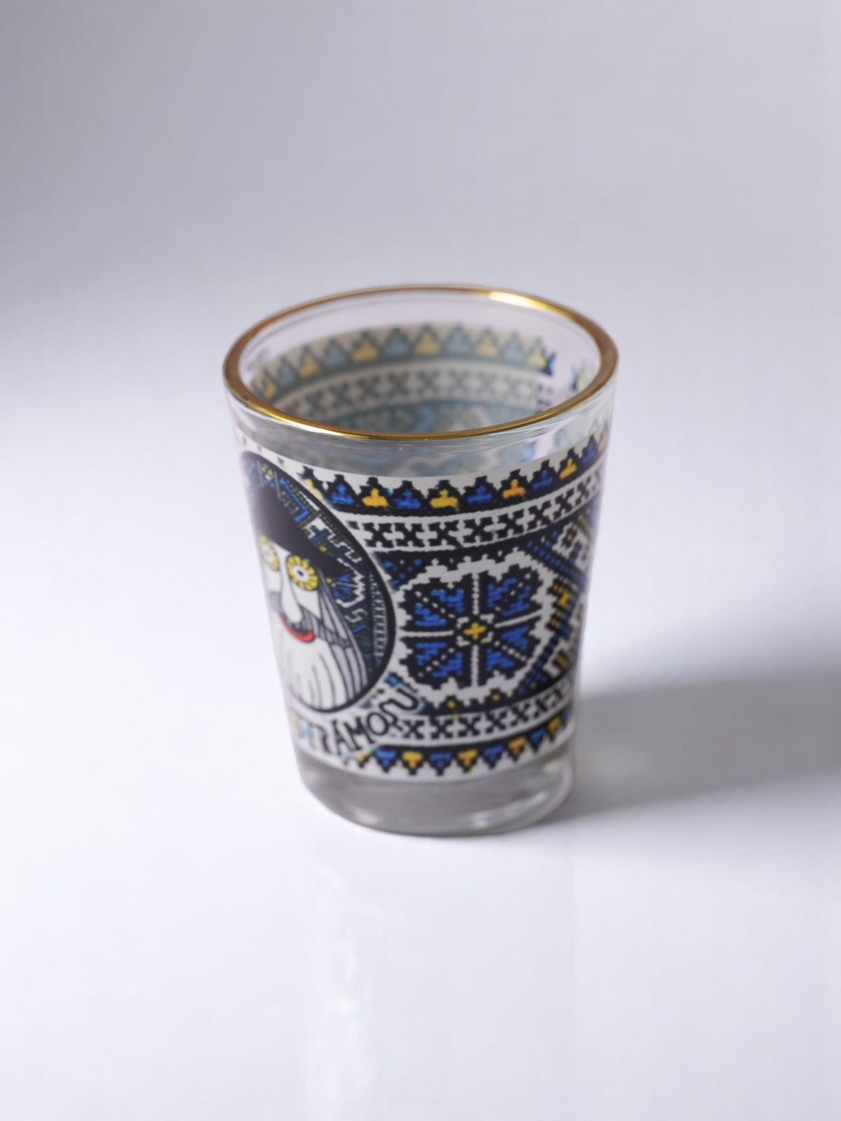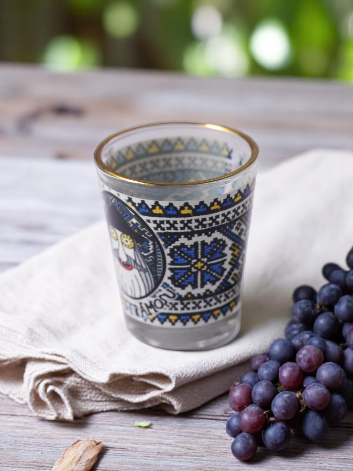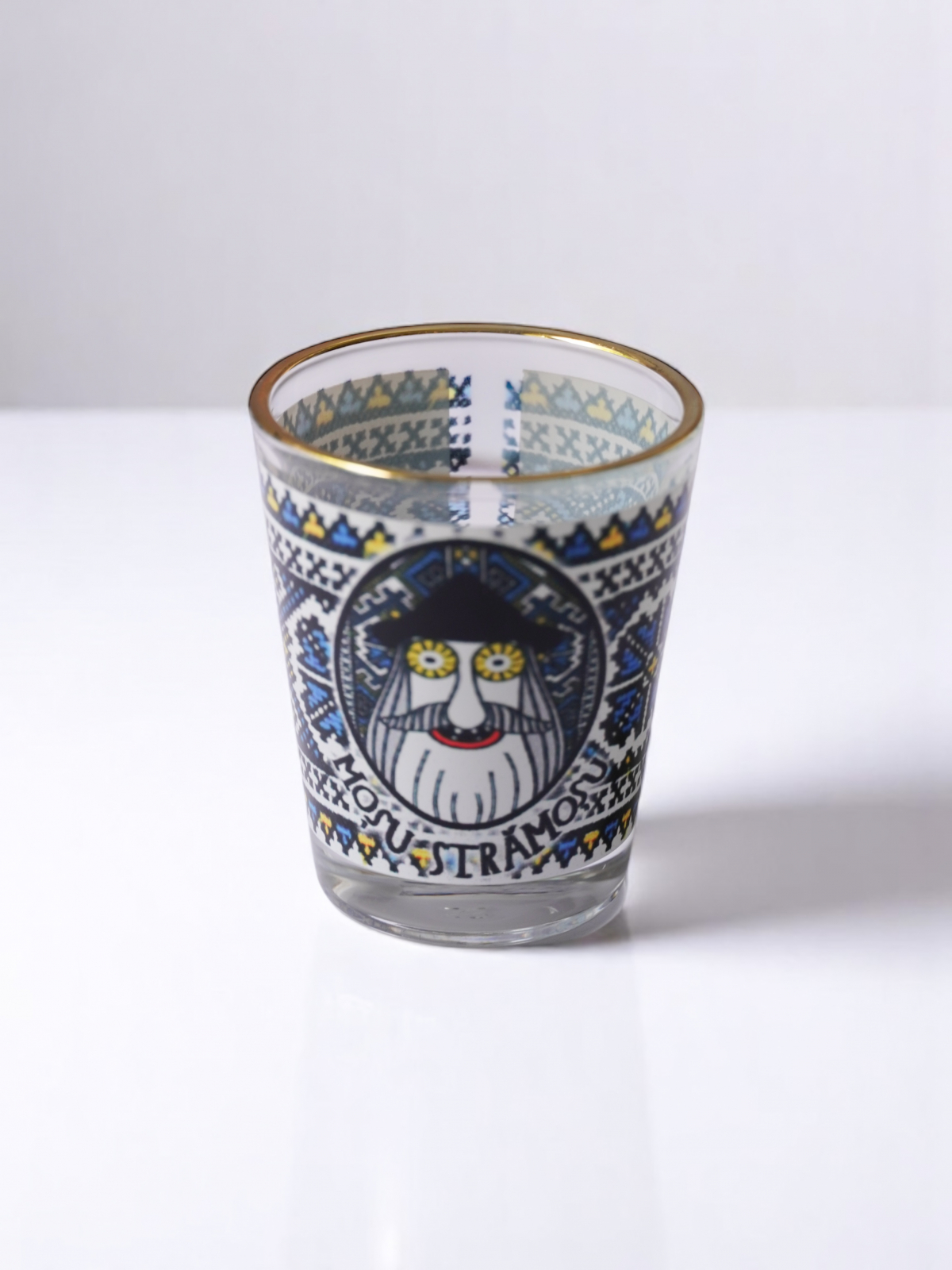 Mic, dar cu suflet mare – acest pahar de omenit prietenii îmbină spiritul tradiției românești cu o doză sănătoasă de umor și culoare. Decorat cu motive maramureșene în nuanțe de roșu sau albastru cu  alb și negru, paharul îl poartă cu mândrie pe MOȘU STRĂMOȘU – înțeleptul cu barbă albă și pălărie neagră, cu o expresie blândă și ochi solari care par să spună povești de demult. Marginea aurie îi oferă un strop de eleganță, iar modelul geometric inspirat din țesăturile vechi aduce aminte de rădăcinile adânci ale ospitalității românești.