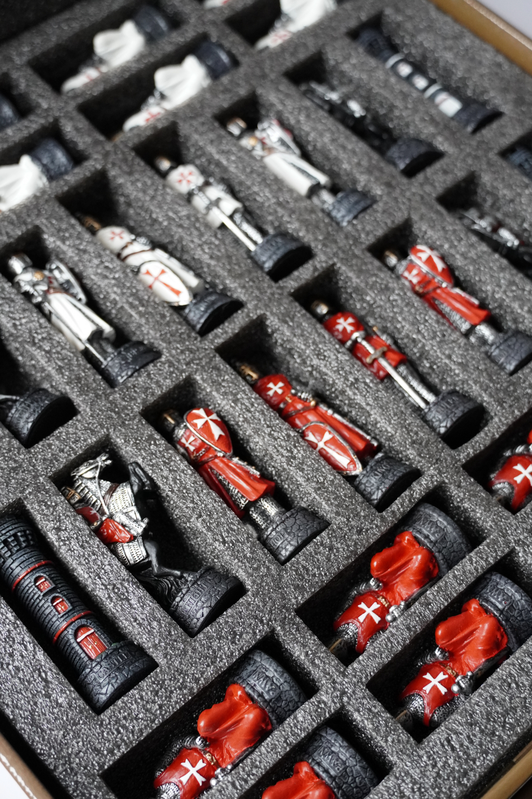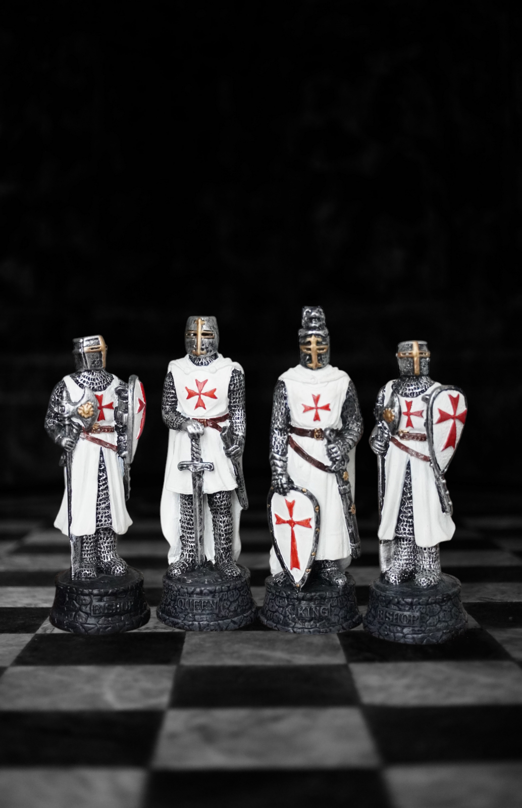 Fiecare piesă este pictată manual cu o atenție minuțioasă la detalii, reflectând măiestria și eleganța cavalerilor medievali. Contrastul dintre alb și roșu evidențiază simbolistica puternică a templierilor, iar sculptura fină surprinde perfect armurile, stindardele și armele lor emblematice. De asemenea, turnurile sunt concepute în stil medieval, adăugând un plus de autenticitate întregului set.
