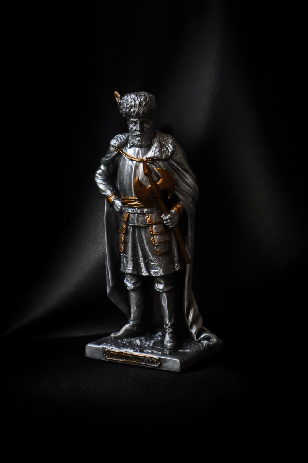 Această statuetă impresionantă îl înfățișează pe Mihai Viteazul în armură de luptă, purtând o mantie impunătoare și sprijinindu-se pe tradiționala sa bardă de război. Privirea sa hotărâtă și postura mândră reflectă autoritatea și determinarea unui conducător care a schimbat cursul istoriei românești. Realizată din aliaj de zinc și plumb, electroplacat cu cositor și nichel sau din rășină pictată manual, piesa surprinde detalii fine ale vestimentației și armamentului epocii, cu o înălțime de aproximativ 10 cm.